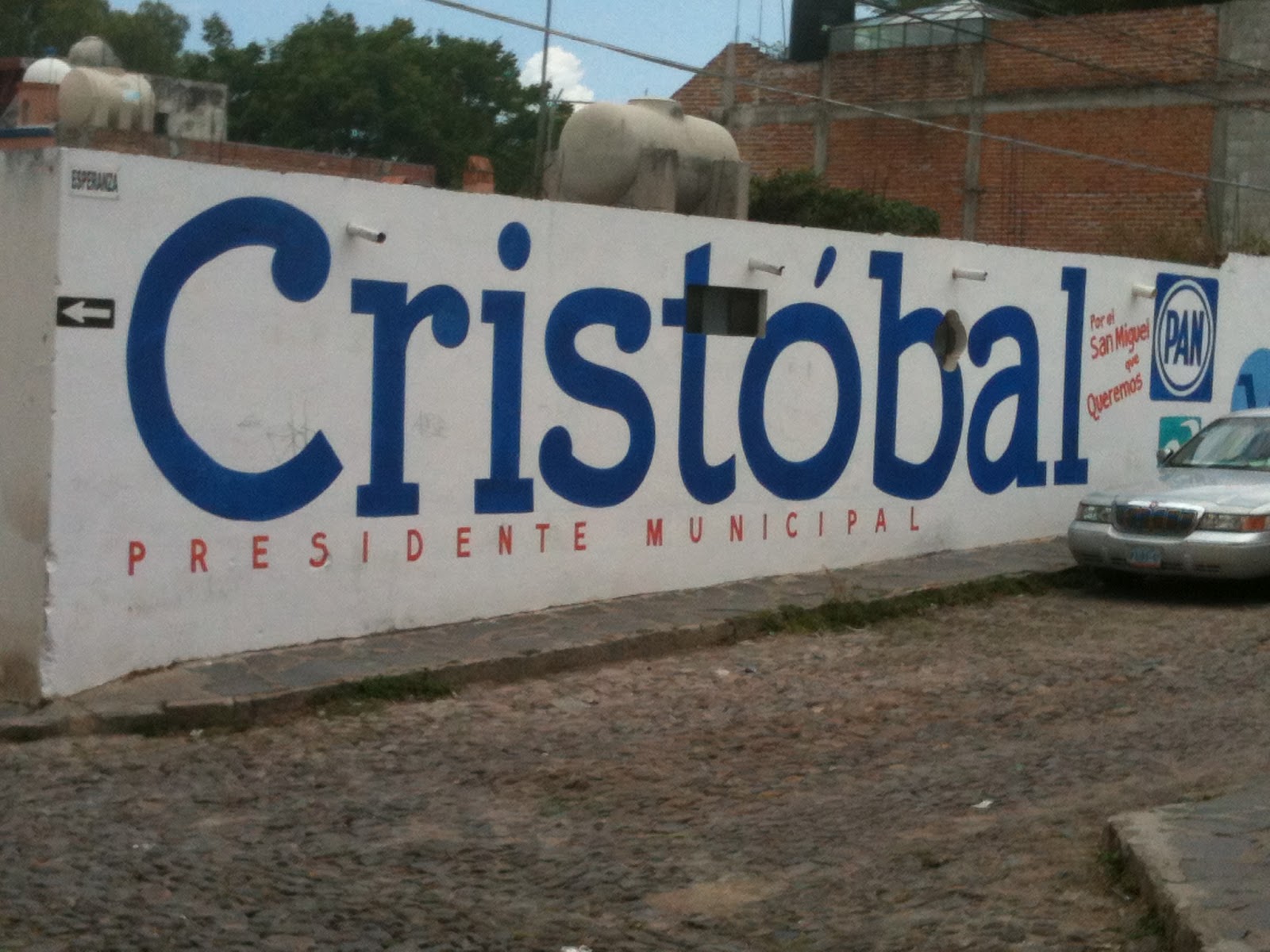 The entire town is simply festooned with campaign signs on every available surface. Because there are walls everywhere -- houses, remember, are built within walls, something I have come to love for the privacy -- the walls serve as perfect surfaces for campaign signs. Some of them, like the next one, have letters that are big enough to be seen from outer space.
